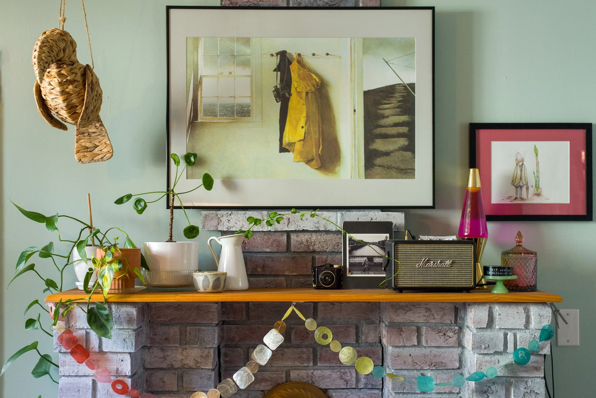 The mantle in my old apartment, with one of my favorite Andrew Wyeth paintings, an iPhone photo I took from a bus in Dublin, and a watercolor by my brother-in-law.